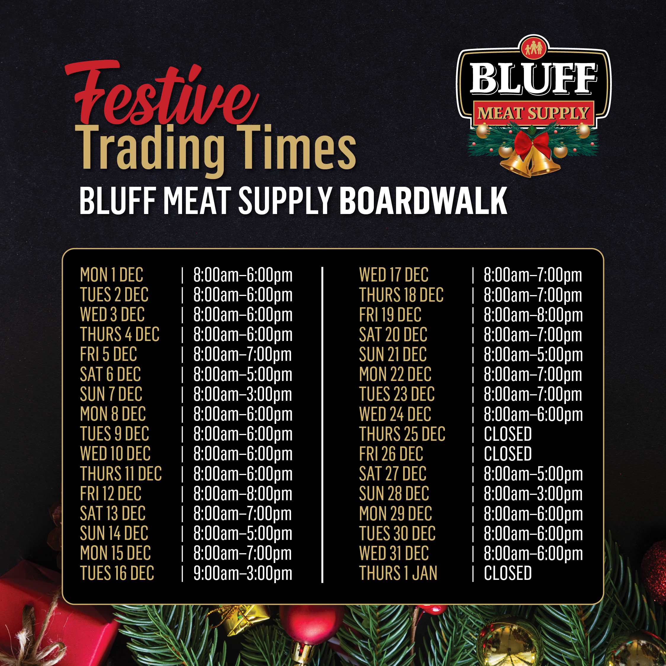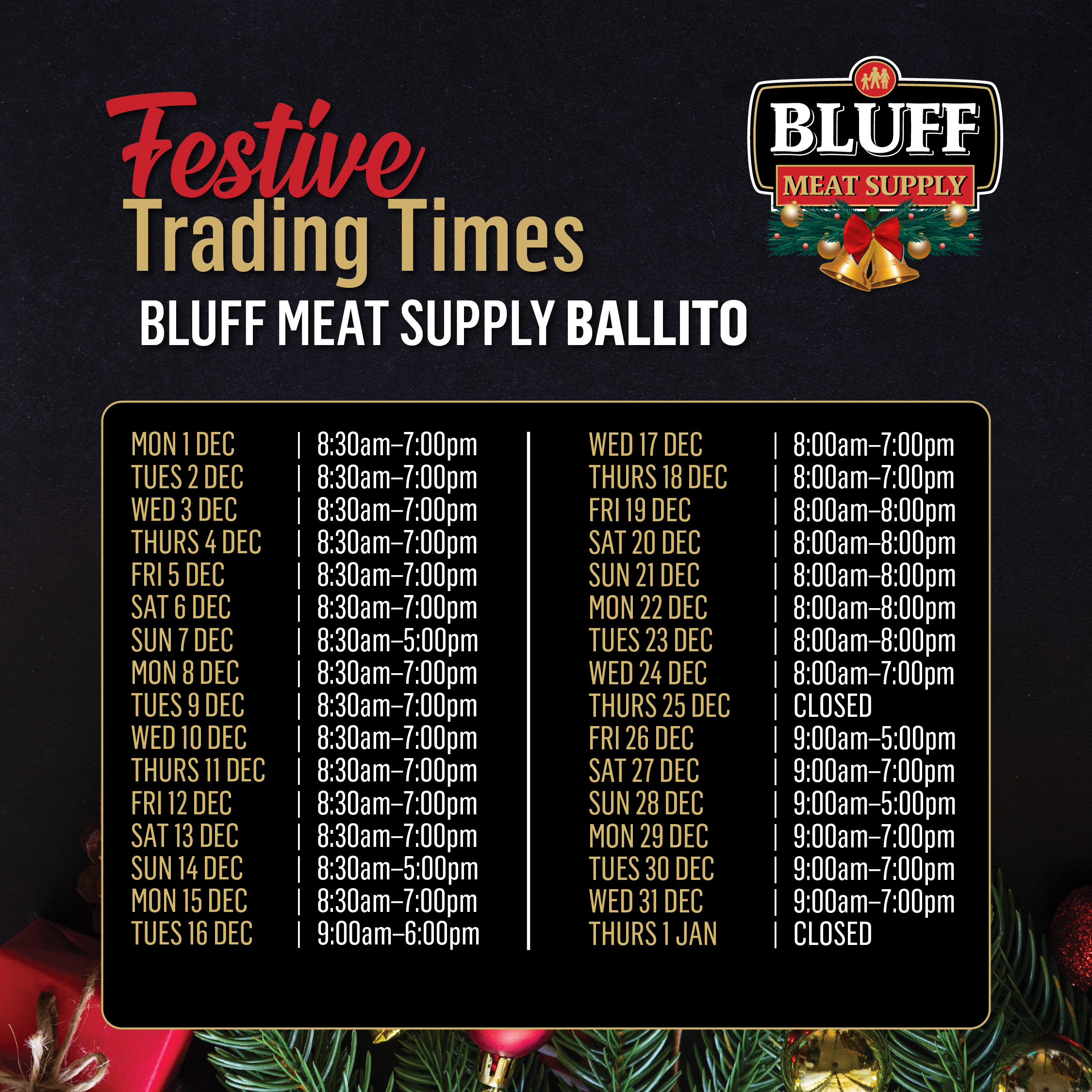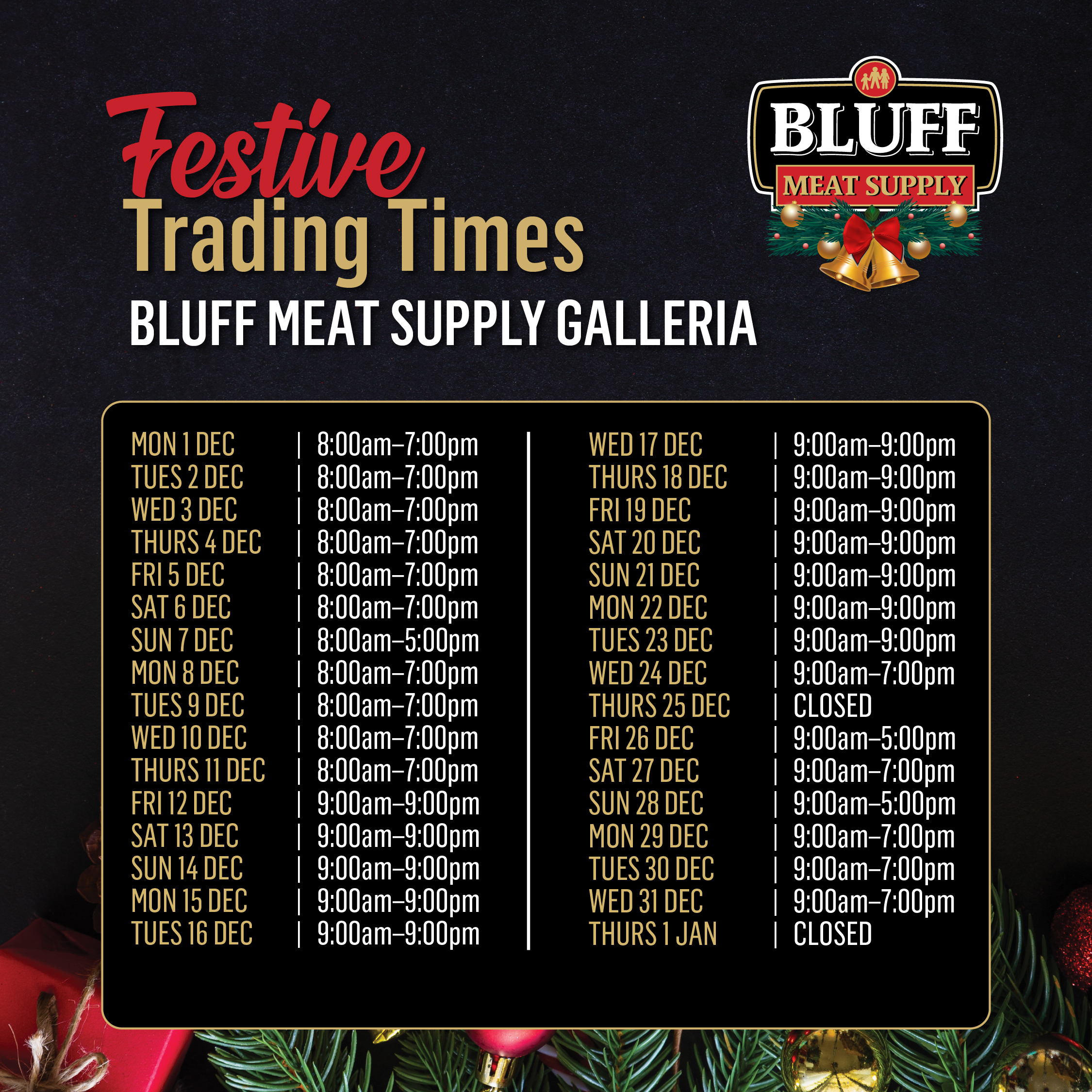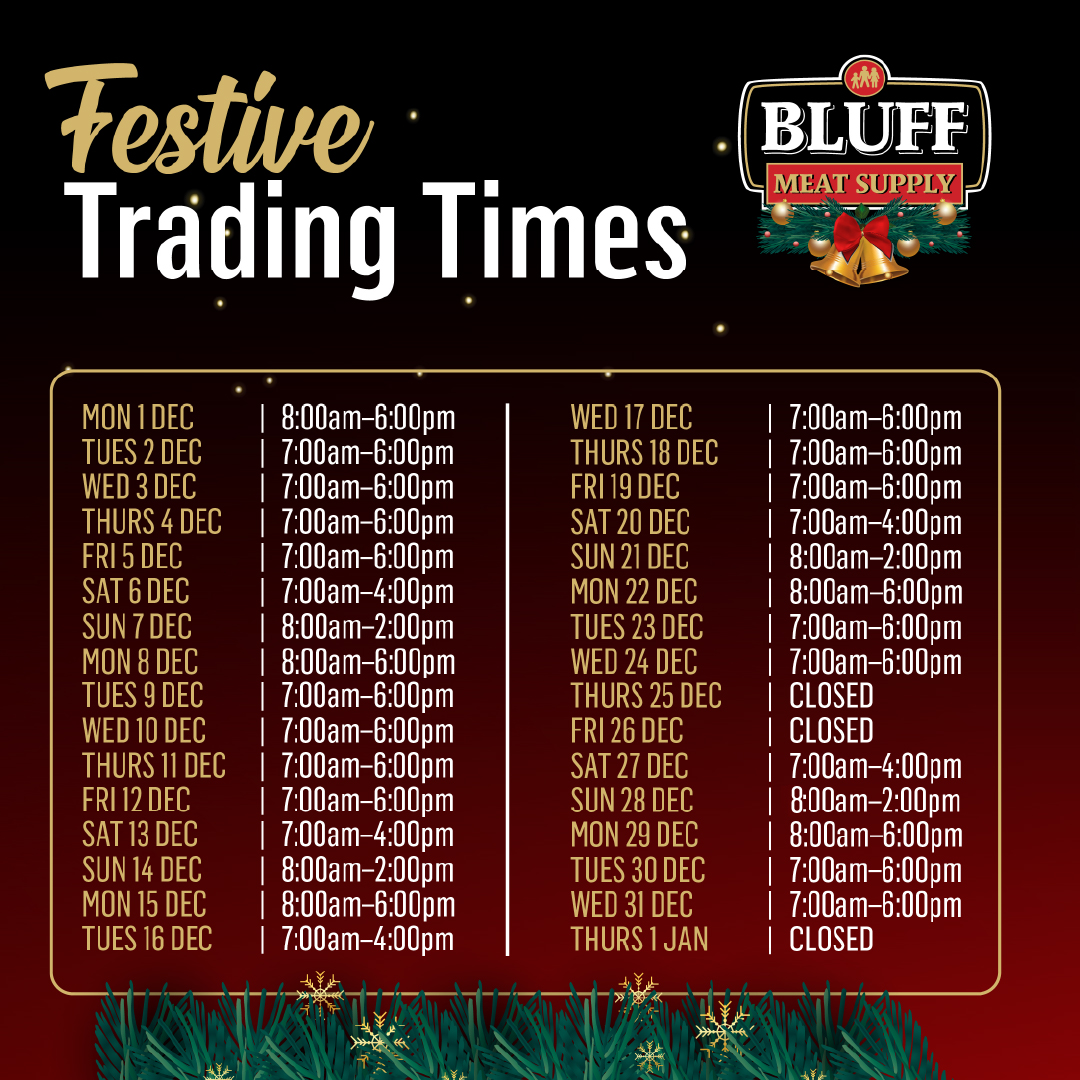 Before you start your holiday shopping, make sure you know your favourite Bluff Meat Supply store’s trading times.