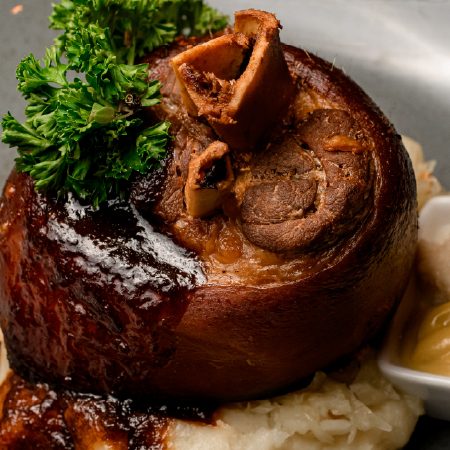 Slow-braised pork shank with creamy mash