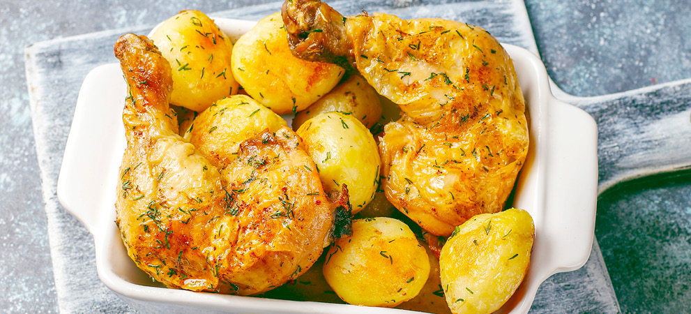 - Line a baking sheet with parchment paper and place the chicken and baby potatoes on it. Pour the spices over the chicken and spread it well from all sides.